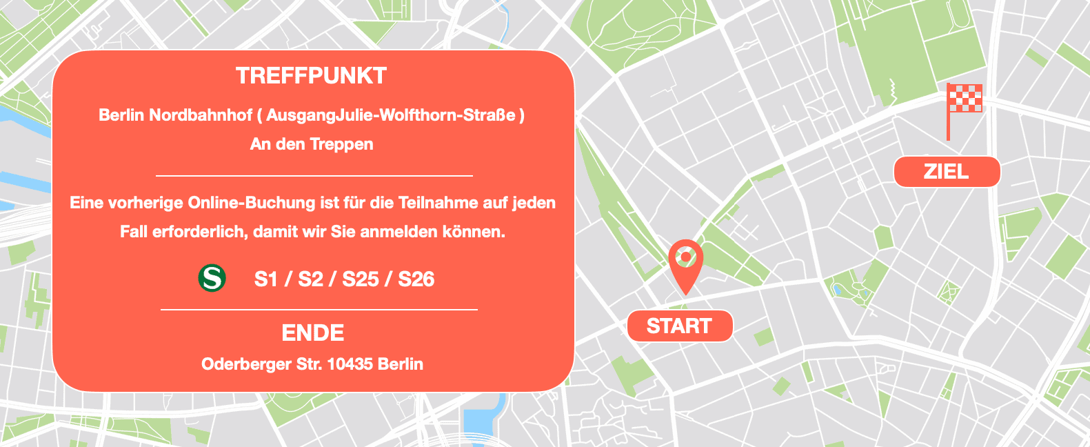 Der Treffpunkt für die Mauer Tour ist der Berliner Nordbahnhof. Die Mauer Tour Berlin findet täglich um 11:00 Uhr statt. Wichtig: Es ist zwingend eine vorherige Online-Buchung nötig, damit wir Sie für die Tour anmelden können. Spontane Ticketkäufe vor Ort sind leider nicht möglich.