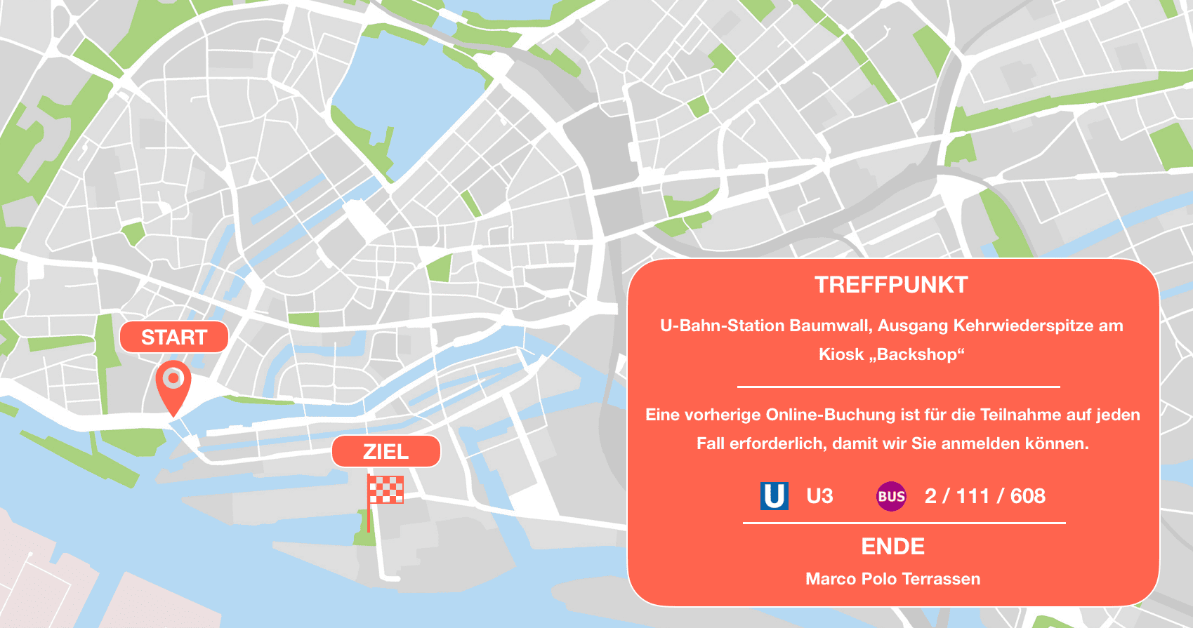 Eine Buchung im Voraus ist zwingend nötig, damit Sie eine Anmeldung für die Speicherstadt & Hafencity Führung erhalten. Ohne Online-Buchung können wir Sie leider nicht einplanen. Ein Kauf unserer Tickets ist vor Ort leider nicht möglich.